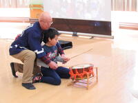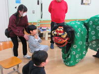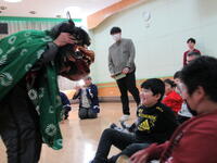 小学部の学部集会で豊郷神楽保存会さんをお招きし、獅子舞の演舞を見せていただきました。子ども達は大きくて迫力のある獅子舞に、「ちょっと怖いなあ。」や「触ってみたい!」、「僕は楽器が気になる!」など子ども達それぞれ、表情や行動は様々な様子でした。始めて獅子舞を見た子ども達も多かったのではないかと思います。日本の伝統芸能に触れる貴重な体験をさせていただきました。