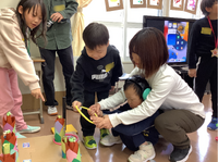 4つの遊びブース(たまいれ、かんたて、さかなつり、わなげ)を体験しました。グループに分かれてブースを巡回し、それぞれのペースで活動を楽しみました。自己紹介で名前を覚え合い、最後には「楽しかった!」と感想を発表する子どもたちの笑顔が溢れました。